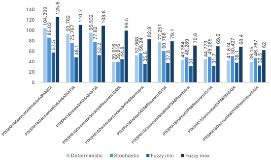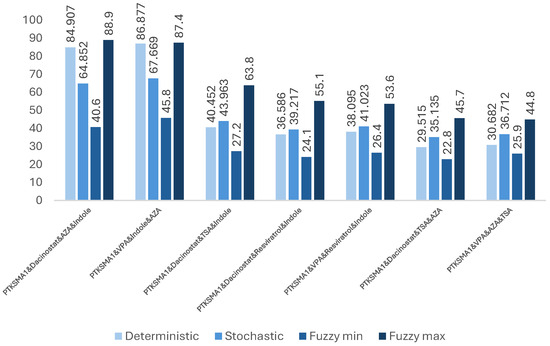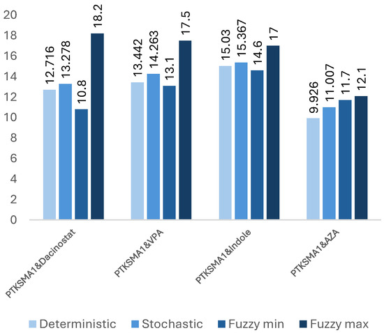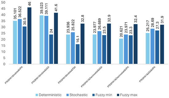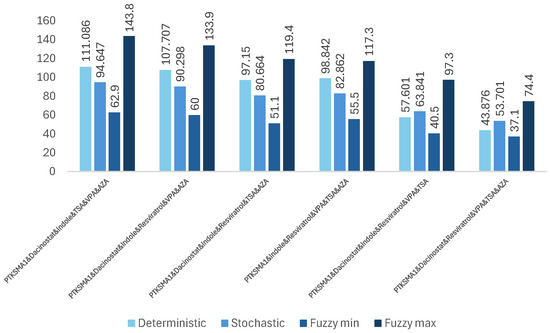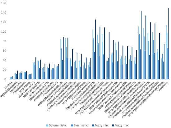 Then, we performed the Dunn–Bonferroni test to compare a pair of related data sets on a single sample to assess whether the data sets have the same distribution. The pairwise comparison of data sets yielded . Hence, we concluded that there is a substantial difference between the distribution of related values in deterministic, stochastic, and fuzzy stochastic simulations. Moreover, statistical analysis reveals that values in the stochastic cases are significantly higher than corresponding values in the deterministic cases and that values in the fuzzy stochastic models are substantially higher compared to related values in the stochastic models. The results of the comparison of the simulation results in line with three paradigms are summarized in Figure 11.