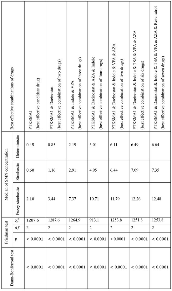First, we conducted the Friedman test. The probability of obtaining the observed results by chance referred to as p-value, less than 0.05, is typically considered statistically significant, indicating that the hypothesis that there are no differences between the groups is rejected. For the case study of SMN synthesis, this value was . The direct implication of this observation is that for the seven best effective combinations of drugs and their combinations shown in Figure 11 there is a significant difference between the medians of the simulation results from three paradigms.