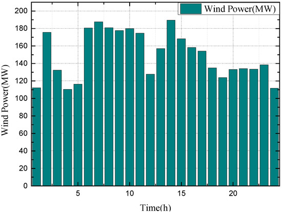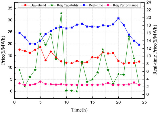 We use historical wind power data from the PJM market to generate wind scenarios, using common scenario-generating methods [20]. Figure 3 shows the wind power curve, which is obtained by averaging the wind power data over various scenarios for a sample day. This averaging process helps to present the trend of the wind power during that day. The maximum ratio of the qualified wind power capacity for regulation to the rated capacity () is 30%, indicating the upper limit of the wind power available for regulation purposes within the given conditions. The anticipated energy prices, encompassing day-ahead and real-time market prices, as well as regulation market capacity clearing prices and performance clearing prices, are sourced from the PJM market [21] and are illustrated in Figure 4. The average mileage ratio of RegD and the performance score are computed based on their historical performance. Given that the interruptible/curtailable (I/C) program is among the most commonly implemented demand response programs currently, this paper uses the I/C program as an example. The incentive is derived from the PJM market as indicated in [22]. For CVaR, the confidence level is set to be 0.9, which is a commonly used value.
