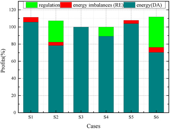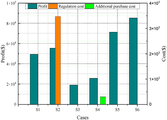 The profit for different bidding strategies is shown in Figure 5, along with the additional costs for market participants in the regulation market. Specifically, the orange bar depicts the revenue loss incurred by WPPs when providing upward regulation services, whereas the green bar indicates the additional purchase costs incurred by DRAs when enabling downward regulation. The cyan bar, on the other hand, represents the overall profits. If the WPP and DRA form a coalition, these costs can be avoided. The profit in the coordinated case is higher than in the uncoordinated cases. For example, the expected profit of the coalition in Case S6 is USD 85,375.4, a 5.0% increase compared to the combined profits of Cases S2 and S4. The expected profits from each market are plotted in Figure 6. Specifically, the green bars depict the percentage of the expected profit derived from the energy market, while the cyan bars represent the percentage of the expected profit originating from the regulation market. Additionally, the red bars indicate the imbalance costs incurred in the real-time energy market. Note that the energy imbalance represents the profit loss caused by the wind forecast error. Comparing Case S1 and Case S5, by coordinating with DR resources, the energy imbalances of the WPP decreased by 6%. In addition, by strategically allocating the resources in different markets, the coalition obtains the market profits with 70.36% energy, 46.54% frequency regulation, and 5.9% energy imbalance in Case S6. It indicates that the coalition obtains significant profits from frequency regulation provision, thus it is beneficial for market participators to bid in both the energy and regulation markets. Comparing Case S2, S4, and S6, the market profit of the cooperation case resulting from the regulation market is larger than the sum of revenues in independent cases. The results show that the proposed coordinated trading strategy can bring higher benefits for WPPs and DR aggregators, taking advantage of their complementary characteristics when participating in the regulation market.