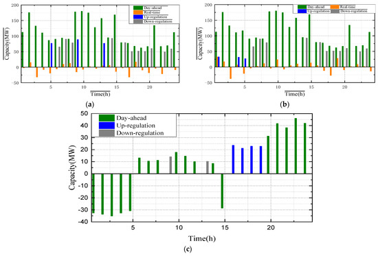 The deployed bidding strategies for WPPs and DR aggregators in the energy and regulation markets (Case S2, Case S4, and Case S6) are shown in Figure 7. Compared with the individual bidding strategies of WPPs and DRAs, the operation of the coalition dispatches wind energy or DR resources to track the regulation signal with the aim of maximizing the total profit. In the cooperation scheme, the up-regulation is provided by the DR resource while the down-regulation is provided by wind power. Figure 7a shows that the WPP provides less capacity in the up-regulation market. The reason is that the wind generator has to reduce its schedule to allow for the up-regulation service, which leads to a loss of revenue. To achieve maximum benefits, most of its capacity is submitted to the energy market. From Figure 7c, it can be seen that the coalition actively participates in the regulation market during 6–9 and 15–24, since during these hours, the regulation market price is higher compared to the other time periods. Comparing Figure 7a–c, more resources are allocated to the regulation market in Case S6 compared to Case S2 and Case S4. The reason is that the cooperation scheme can optimize the operation states of wind generator and DR resources to respond to regulation signals more economically. In this way, the operator can provide regulation capacity by dispatching wind power or DR resources at lower costs.