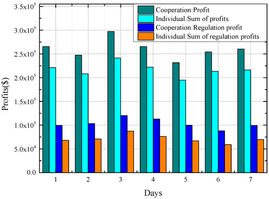 To further explore the capabilities of the proposed trading scheme, simulations over 1 week (1–7 May 2020) have been implemented and the daily profits are shown in Figure 8. The green and cyan bars represent the market profit for the cooperation case and sum of profits for independent cases, respectively, whereas the blue and orange bars denote the expected profit of coordinated power plants and uncoordinated power plants obtained from the regulation market. Although the daily profit fluctuates, it can also conclude that the market profit of the coordinated case is higher than the sum of profits in individual cases. The average regulation-related profit is also remarkable, accounting for 39.73% of the total profit of the cooperation case. More specifically, the average regulation-related revenue in the coordinated case increased by 31.0% with respect to that in the uncoordinated case.