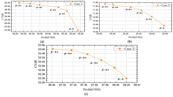 To analyze the impact of the risk aversion, take cases S2, S4, and S6 as examples: the expected revenue of the market participants and the CVaR for different risk-averse parameters of β are calculated and presented in Figure 8. It can be seen that the three curves show the same trend. When β increases, the CVaR increases, while the revenue of market participants decreases. For example, in Case S2, when β increases from 0 to 0.5, the value of CVaR is increased by 6.7% while the market revenue is decreased from USD 55,534.5 to USD 54,029. For Case S4, the CVaR increased by 11.4% while the market revenue decreased by 3.47%. In addition, the results show that with a slight decrease in market revenue, the CVaR is highly reduced. This indicates that the variation in the CVaR is bigger than that of the market revenue. Furthermore, comparing Figure 9a–c, with increasing risk-averse parameter β, the rate of decrease in market profit in the cooperative case is lower than that of individual cases. From the result, the decision maker can make an appropriate bidding strategy based on the tradeoff between expected profit and CVaR, because CVaR not only effectively measures the potential downside risk but also provides a clear risk-return trade-off benchmark in various market conditions, enabling decision makers to better balance profit-seeking and risk-controlling.