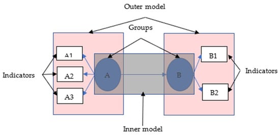PLS–SEM is an effective technique that may be used to diagnose complicated models with several latent groups and observable indicators. It makes it easier to estimate the inner model, which evaluates relationships between various latent groups, and the outer model, which captures associations between latent groups and their indicators. Figure 1 displays the components of a simple PLS–SEM model, and also shows a PLS–SEM model with two latent groups (A and B). Group A has three indicators (A1, A2, and A3). At the same time, group B has two indicators (B1 and B2). In this example, group A impacts group B (A→B). Therefore, group A is exogenous, and group B is indigenous. The relationship between group A with its indicators (A1, A2, and A3) and the relationship between group B with its indicators (B1 and B2) represent the outer model. At the same time, the relationship between group A and group B is the inner model, as shown in Figure 1. This adaptability is particularly useful when examining complicated causal interdependencies across different groups []. PLS–SEM also enables researchers to find significant factors, propose new ideas for investigation, and examine interactions and patterns within data. Adaptability and handling small sample sizes make it suitable for exploratory research []. Various studies extensively utilize PLS–SEM to assess risks across different sectors. For instance, Wong Chin Yew et al. [] employed PLS–SEM to explore the relationship between safety risks and mitigation steps in the Malaysian construction sector. Other previous studies have not utilized PLS–SEM to assess risk factors of cost overrun in construction projects that incorporate BIM during construction. More research is needed to examine interdependencies and influences among significant risk factors in this context.