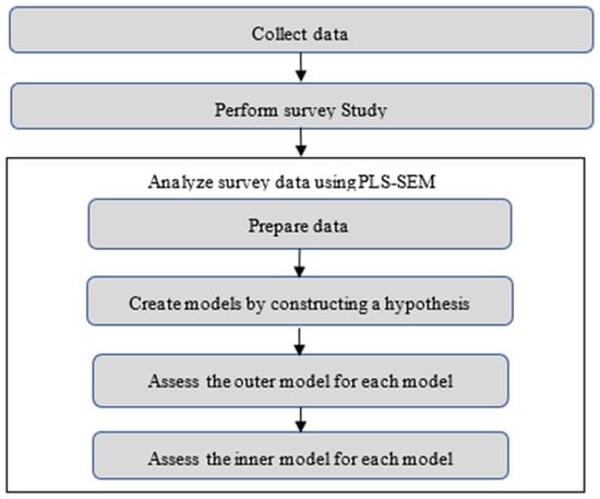 Analysis of survey data using the PLS–SEM method involves a systematic process encompassing four distinct stages, as shown in Figure 2. Data are meticulously prepared and processed in the first stage to address any missing or incomplete information, ensuring that the dataset is complete and accurate for subsequent analysis. Multiple models are constructed by formulating various hypotheses that capture the relationships between different risk factors within each model. These hypotheses serve as frameworks to explore and assess interdependences among risk factors. The third stage involves conducting outer assessments of each model regarding construct and discriminant validities. Finally, in the fourth stage, inner assessments were carried out. Here, the focus shifts to hypothesis tests of relationships among group risk factors for each model.