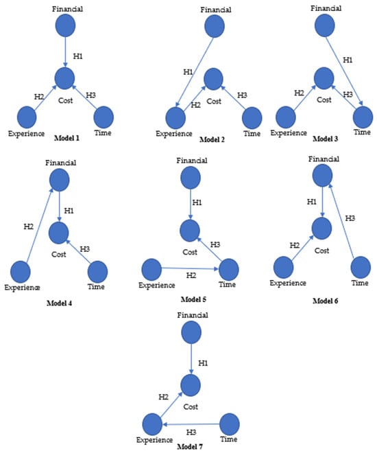 This section aims to determine the number of required models to identify significant risks, examine interdependencies among groups’ risk factors, and then create a necessitated hypothesis for each model. Three groups (Experience, Financial, and Time) were used to determine the number of required models. Therefore, the required number was a factorial 3 (3! = 3 × 2 = 6), making six models. In addition, there was an additional model to examine the direct relationship between the three groups and the cost overrun group. Therefore, the total number of models was seven. Each model had three relationships (hypotheses), represented by an arrow motion from one group to another. Seven models are shown with their relationships (Figure 3). Hypothesis statements for each model are given in Table 3. Model 1’s objectives were to determine key risk factors and evaluate the direct impact of Time, Experience, and Finance on cost overruns. Other than that, Models 2, 3, 4, 5, 6, and 7 examined the impact of associations among the three risk factors groups (Financial, Experience, and Time). The cost overrun group is an Indigenous latent group, whereas the three groups in Model 1 are exogenous latent groups. To investigate the impact of the financial risk factors group (Financial) on the experience risk factors group (Experience), Model 2 (Figure 3) was run.