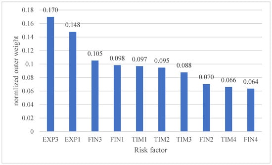 An inner model assessment was conducted to identify and rank significant risk factors. This assessment involved performing hypothesis tests on Model 1. Results revealed that p-values of H1, H2, and H3 were below threshold value, indicating that all three hypotheses were accepted and suggesting that the three groups examined significantly impact cost overrun. Furthermore, weight loadings of the remaining ten risk factors were normalized and ranked in descending order, as depicted in Figure 5. The two highest-ranked risk factors were EXP3 and EXP1, indicating their strong influence. Several intermediate significant risk factors were identified, including FIN3, FIN1, TIM1, TIM2, and TIM3. On the other hand, the remaining risk factors (FIN2, TIM4, and FIN4) exhibited lower significance levels.