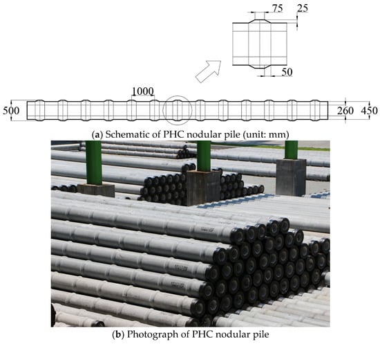 The pre-stressed high-strength concrete (PHC) nodular pile is a type of PHC pile with variable pile cross-section, and the nodules designed along the shaft with a certain distance is mainly to improve the bearing capacity of the pile. The PHC nodular pile is often used in ground treatment projects in soft soil areas. The bearing capacity of a conventional PHC pipe pile embedded in soft soil areas is generally hampered by the poor engineering properties of soft soils, and the pile shaft strength cannot be fully mobilized. The nodules of a PHC nodular pile can improve the shaft capacity as well as the entire bearing capacity of the pile [1]. The behavior of a pile with variable cross-section of pile shaft has been investigated by many researchers. In Japan, the behavior of a nodular cylinder pile or muti-node piles has been investigated through model tests [2,3]. The test results indicated that the ultimate bearing capacity of a nodular cylinder pile could reach 2.5 times the ultimate bearing capacity of a pipe pile [2]. Moreover, the effect of nodule number and pile shaft roughness was also investigated through model tests, and the test results showed that the behavior of the nodular pile was affected by soil properties and nodular spacing [3]. For the pile end capacity, Malik et al. [4] investigated the end capacity of a straight pipe pile and screw pile under similar environments, and the test results showed that the ultimate capacity of the screw pile was 2–12 times higher than that of the pipe pile.