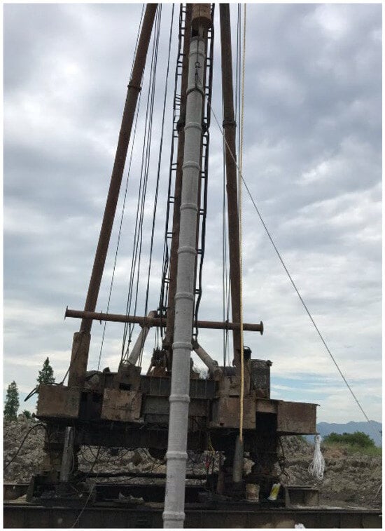 In this research, the 450 (500) mm PHC nodular pile was adopted in the field tests, as shown in Figure 1. The diameter of pile shaft was 450 mm, and the nodule diameter increased to 500 mm. The thickness of pile shaft wall was 95 mm. Moreover, it can also be seen in Figure 1 that the height of nodule was 25 mm, and the inclination angle was 26.6°. The distance of the adjacent nodule of 450 (500) mm PHC nodular pile was 1 m, and the ratio of nodular spacing/nodular diameter was 2. The entire length of the test PHC nodular pile was 40 m, and the pile segments were 13 m, 13 m and 14 m long, respectively. The test PHC nodular pile was driven into the ground directly by the piling rig, as shown in Figure 2.