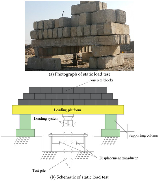 The disturbance induced by PHC nodular pile installation was larger than that of the PHC pipe pile, and the static load tests were conducted 40 days after the installation of test PHC nodular piles. The static load test process referred to the local specification for the testing of building foundation piles [20], and the slow maintained loading method was adopted in the loading process. The photograph and schematic of the static load test of the PHC nodular pile are presented in Figure 3.
