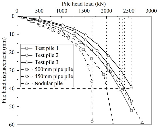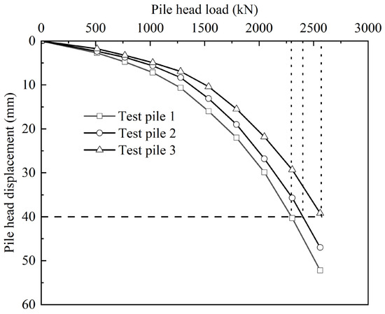 The measured pile head load and displacement of three test piles were then arranged as shown in Figure 4. This figure shows that the load–displacement curve of three test piles were relatively close to each other. The pile head displacement increased linearly with pile head load when the applied load increased from 0 to 1024 kN. The pile head displacement of three test piles were all around 6 mm when loaded to 1024 kN. The displacement then increased with a larger increasing rate when the applied load increased from 1024 kN to 2564 kN. When the applied load reached 2564 kN, the displacement of three test PHC nodular piles reached 52.2 mm, 47 mm and 39.2 mm, respectively. The pile head load is normally considered as the ultimate capacity when the pile head displacement reaches 40 mm [20]. The ultimate bearing capacity of three test piles were 2296 kN, 2401 kN and 2582 kN, respectively, and corresponding pile head displacement reached 40 mm.