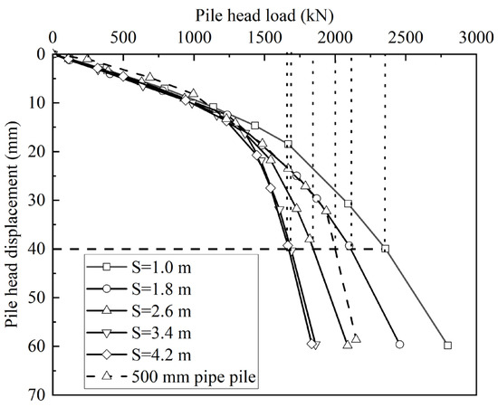 The nodular spacing of the PHC nodular pile S was set as 1 m, 1.8 m, 2.6 m, 3.4 m and 4.2 m, respectively, in the modeling, and the calculated load–displacement responses of PHC nodular pile with different nodular spacing were arranged as shown in Figure 7. It can be seen in Figure 7 that the bearing capacity of the 450 (500) mm PHC nodular pile with a nodular spacing of 1 m and 1.8 m was better than the bearing capacity of 500 mm PHC pipe pile. When the pile head displacement reached 40 mm, the ultimate bearing capacity of the 450 (500) mm PHC nodular pile with a nodular spacing of 1 m and 1.8 m were 2357 kN and 2109 kN, respectively, which were larger than the ultimate bearing capacity of 500 mm PHC pipe pile. Nevertheless, when the nodular spacing increased to 2.6 m, the ultimate bearing capacity of the 450 (500) mm PHC nodular pile decreased to 1843 kN, which was smaller than the ultimate bearing capacity of the 500 mm PHC pipe pile. When the nodular spacing increased to 3.4 m and 4.2 m, the ultimate capacity decreased to 1688 kN and 1678 kN, respectively, which was close to the ultimate bearing capacity of the 450 mm PHC pipe pile.