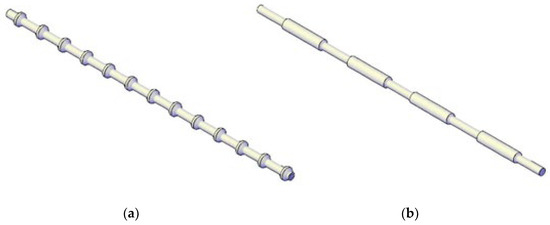 Two typical types of the PHC nodular piles (named as type A and type B) are normally used in engineering projects, as shown in Figure 8. For type A PHC nodular pile, the diameter/length ratio of nodule is relatively large, as shown in Figure 8a. For type B PHC nodular pile, the nodule length is large, and the diameter/length ratio is relatively small, as shown in Figure 8b.