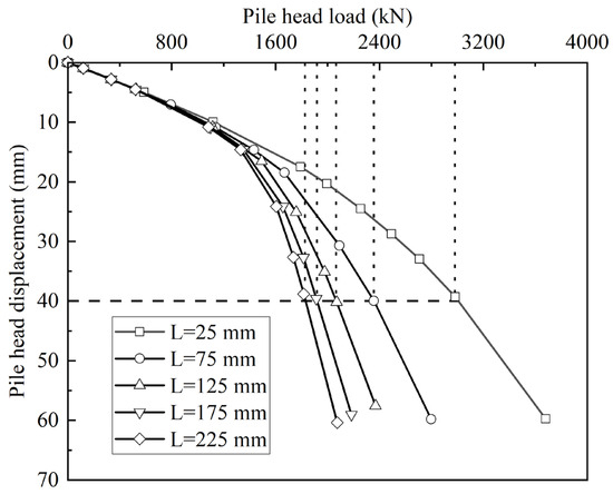To investigate the influence of nodular length on the bearing capacity of the PHC nodular pile, the nodular length L was designed as 25 mm, 75 mm, 125 mm, 175 mm and 225 mm, respectively. The calculated load–displacement responses of the PHC nodular pile with different nodular lengths are arranged as shown in Figure 9. It can be seen in Figure 9 that the bearing capacity of the PHC nodular pile would decrease with the increase in nodular length, and the pile head displacement of the PHC nodular pile with different nodular length all increased stably with the pile head load. When the pile head displacement reached 40 mm, the ultimate bearing capacity of the PHC nodular piles were 2984 kN, 2357 kN, 2067 kN, 1920 kN and 1827 kN, respectively, as the nodular length increased from 25 mm to 225 mm. The ultimate bearing capacity of the PHC nodular pile decreased by 39% as the nodular length increased from 25 mm to 225 mm. Hence, the increase in nodular length would hamper the bearing capacity of the PHC nodular pile, and the type A PHC nodular pile was more suitable to improve pile capacity.