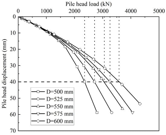 To investigate the influence of nodular diameter on the bearing capacity of the PHC nodular pile, the diameter of PHC nodular pile D was set to be 500 mm, 525 mm, 550 mm, 575 mm and 600 mm, respectively, and the diameter of pile shaft was set to be 450 mm. The simulated load–displacement responses of the PHC nodular pile with different nodular diameter are arranged as shown in Figure 10.