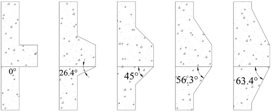 Apart from the nodular diameter and nodular length, the inclination angle of the nodule will also affect the bearing capacity of the PHC nodular pile. The tangent value of the inclination angle of nodule (tan α) was set as 0, 0.5, 1, 1.5, and 2 (α = 0°, 26.6°, 45°, 56.3°, and 63.4°), respectively, as presented in Figure 11. The calculated load–displacement responses of the PHC nodular pile with different inclination angles are arranged as shown in Figure 12.