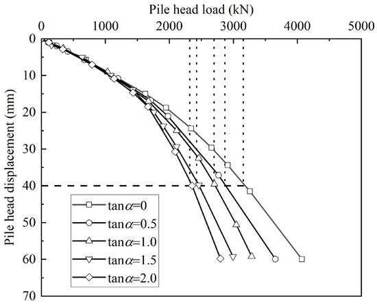 Figure 12 shows that the pile head displacements of the PHC nodular pile with different inclination angles all increased stably with pile head load, and the ultimate bearing capacity of the PHC nodular pile decreased with the increase in inclination angle of nodule. The ultimate bearing capacities of the PHC nodular pile were 3186 kN, 2882 kN, 2719 kN, 2467 kN and 2357 kN, respectively, as the value of tan α increased from 0 to 2. However, it should also be noted that the disturbance induced by pile installation would increase with the decrease in the inclination angle of the nodule. When the inclination angle of the nodule was 90°, the PHC nodular pile would become a PHC pipe pile. When the inclination angle of nodule decreased to 0°, the inclination angle of nodule would become a right angle and the installation effect of the PHC nodular pile would become the largest.