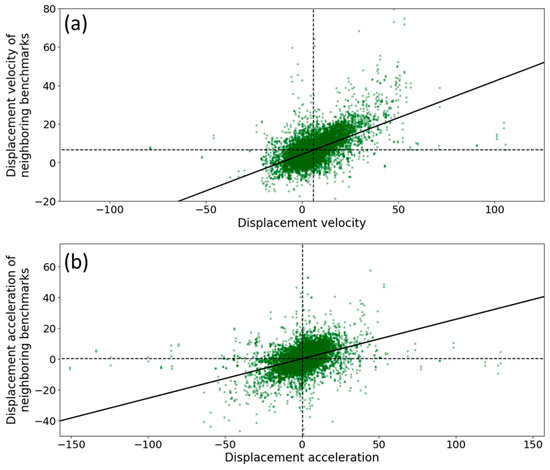 Moran scatterplot for displacement velocity (a) and displacement acceleration (b).