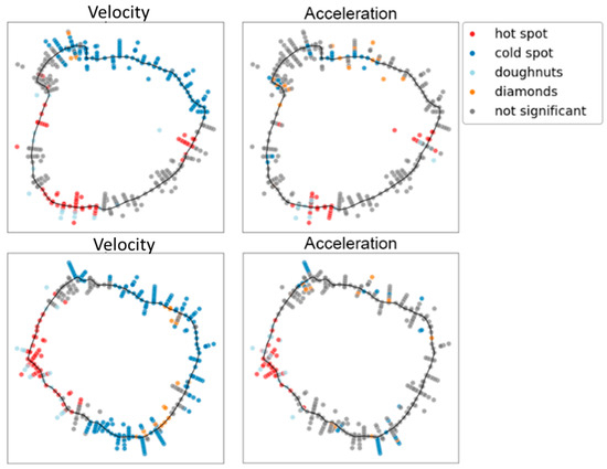 Hot spot analysis result for velocity and acceleration of displacement for two sample simulations.
