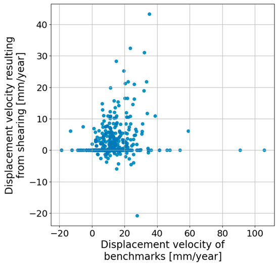 One of the goals of the study was to develop a model that would be able to indicate the presence of a shear zone in relation to surface displacements. It was assumed that the shear displacements will affect the surface displacement. However, the analysis showed no unequivocal relationship visible at each measurement point. The displacement recorded by benchmarks can be influenced by many factors, and shearing is only one of them. In addition, the nature of the dependence at different dam locations may be different due to the different geological structures and a number of other factors. It was also noticed when comparing the annual increments of benchmark displacements with the increments of displacements caused by shearing in individual locations. There is no correlation in the scattering diagram, and in addition, it can be seen that large surface displacements may appear in places where the amount of shear has not changed (Figure 5). The coefficient of determination obtained for the relationship between the velocity resulting from shear and the velocity of benchmark displacement for the entire sample is only about 0.03, which indicates a lack of linear relationship between the variables.