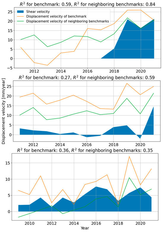 When looking at individual locations, it can be seen that there is a certain dependency. The displacement of adjacent benchmarks was also taken into account, for which sometimes there is a greater dependence than in the case of displacements in the same location (Figure 6). For each example, values were determined for the linear regression fit between both the shear velocity and the displacement velocity of the benchmark at the same location and between the shear velocity and the displacement velocity of adjacent benchmarks. For the presented examples, the values range from 0.27 to 0.84. In some cases, a higher value is obtained for the fit to adjacent benchmarks. This shows that the relationship between underground shear and surface displacement can be partially described by linear regression. However, it is necessary to add a variable related to the location to the analysis. Additionally, it can be seen that not only is the displacement at one specific point valuable information, but also in the adjacent surroundings.