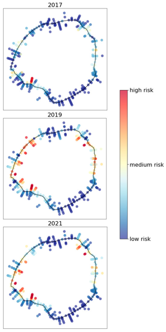 Due to the existence of different relationships in different locations, it was decided to use the GWR model to describe the observed phenomena. It is used to select regression coefficients relative to geographic location. The model uses the independent variables the velocity of benchmark displacement and the velocity of displacement of benchmarks in the vicinity, and the dependent variable is the velocity of displacement resulting from shearing. A model with and was obtained, which means that the accuracy is medium, as it explains about 45% of the values. The second indicator shows the possible expected difference between the predicted and actual value. The obtained value in the case of small shears indicates the possibility of a significant relative difference in values. This confirms the assumption that underground shears do not depend only on surface displacements, but the result can be used to estimate the shear risk. Hence, the decision was made to streamline the presentation of results, focusing solely on the level of risk. Predicted higher shear values correspond to greater risk and lower shear values mean less risk. An exemplary visualization of the results with a comparison of the risk of shearing in three years is shown in Figure 7. Attention should be paid to the changes in risk areas over time. There was an increase first and then a slight decrease, which could imply using measures to reduce displacements. A greater risk is also usually noticeable inside the dam compared to outside.