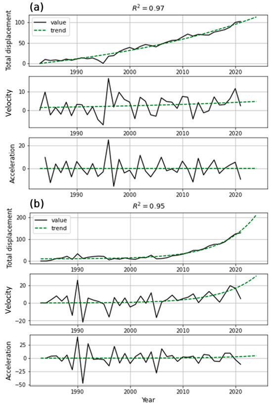 Figure 8 shows two examples of benchmark displacement measurements with determined trends. It can be seen that the exponential trend describes the behavior of the total displacement well; the value of the R-squared is above 0.9. In the case of velocity and acceleration, the values are already far from the trend, but it is still visible that they are following it. In most cases (including those presented), the velocity has a slight upward trend, and the acceleration is rather constant. However, assuming the occurrence of the trend described by the exponent function, it is known that the acceleration will also start to increase after some time. This moment may be critical for the dam’s stability. The trends have also been projected three years ahead. Although the values are still unknown, the method can identify a trend, allowing for a short-term prediction of the displacement trend over time.
