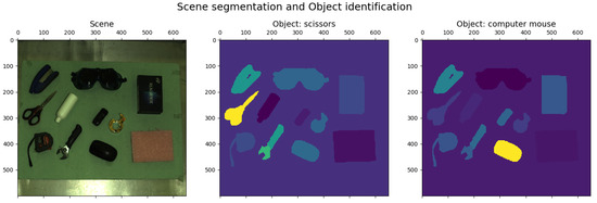 The 2.5D semantic depthmap is obtained by associating a depth value with each pixel in the segmented image. When using most depth cameras, this may involve the additional step of registering the depth image in the RGB image reference frame. However, in cases where an already-aligned depth channel is available, this is essentially “free”. For this demonstrator, a fixed Zivid One+ depth camera was used, which provides a registered depth image. To turn this into a map of the robot’s environment, an extrinsic calibration to the workspace coordinate frame and the camera’s intrinsic parameters are required (see Section 5.1), enabling conversion between the depth values and point coordinates in .