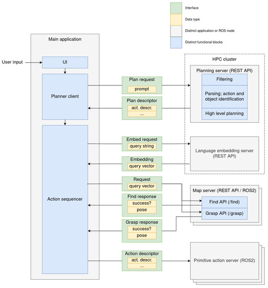 When drafting a system architecture, it is important to first define the use-case and user interaction scenario. In this case, we constrain the scenario to feature the human operator of a workstation overseeing the robot control system issuing commands in natural language. This inherently couples the user interaction with other low-level control elements of the system, and we therefore place the LLP application at the core of the architecture. Action primitives are hosted as action servers, performing a parameterized motion when called. The HLP, image segmentation, text embedding, and map components of the system are deployed separately, to decouple their computational constraints from each other and the robot control system hardware. The system, a schematic of which is presented in Figure 2, executes the following event loop, driven by the main application which is integrated with the LLP: