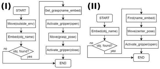 A set of five action primitives is defined following the action–activity hierarchy defined in [40]: embed, find, get_grasp, move and activate_gripper. These action primitives can be divided into subgroups such as for perception, consisting of embed, find, get_grasp and for robot motion, which includes move and activate_gripper.