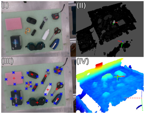 A scene in the reference data set (see Section 5.2) (I) Image of the scene. (II) Vector octree map reconstruction at a resolution of 0.01 m, colored by similarity to the query “scotch tape”, with a grasp pose estimate indicated by a shifted coordinate axes markers. (III) Manually annotated reference grasps. Center (red cross) and direction (blue asterisk) indicators drawn as seen by the user of the data set tagging utility. (IV) A visualization showing a semantic map grasp pose estimate and the corresponding ground-truth annotation.