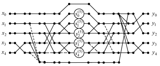 A data flow graph of the proposed algorithm of the five-point DHT-II is presented in Figure 4. In particular, the number of multiplication operations may be reduced from 16 to 5, but the number of addition operations is increased from 20 to 23.