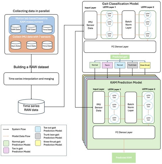 First, in the simultaneous measurement phase and the data acquisition and processing phase, the reference KAM data and data from the IMU sensor required for training are collected simultaneously and integrated into a single trainable dataset through the RAW dataset construction phase. After that, the RAW data are pre-processed to make it favorable for learning, and then the LSTM-RNN model is used for learning and prediction. This process is illustrated in Figure 1, which shows the overall flowchart of the system.