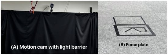 Laboratory environment with motion camera (A) and force plate (B) installed.