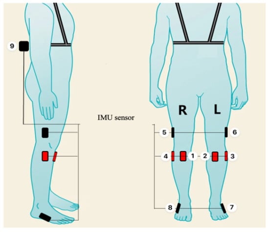 Figure 3 shows the IMU sensor attachment locations for the participant. Sensors 1, 2, 3, and 4 are 6-axis sensors, attached to the knee, collecting data from the knee. Sensors numbered 5, 6, 7, 8, and 9 are 3-axis sensors and collect ankle and thigh data.