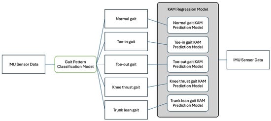 In comparison with previous studies, our approach introduces a Multi-model Gait-based KAM Prediction System that utilizes a two-step method. First, it classifies gait patterns based on IMU sensor data, and then applies a specific regression model tailored to each classified gait pattern. Unlike the single-model approach employed in studies such as Wang et al. [], our method improves prediction accuracy by integrating classification and regression processes, which allow the system to adapt its prediction model based on specific gait characteristics. By capturing these gait-specific nuances, our model achieves superior accuracy in KAM prediction, particularly when compared with a single-model system that does not account for gait pattern variation.