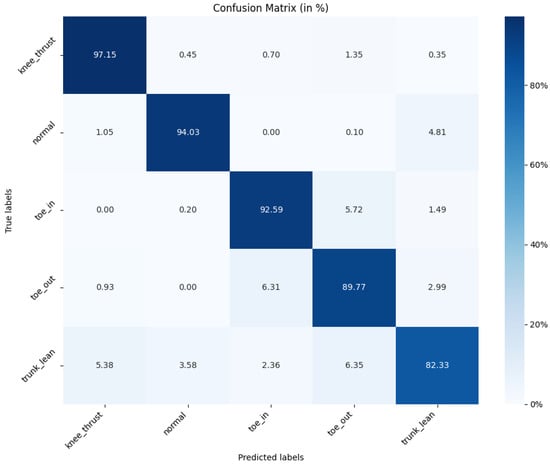Accuracy is defined as the percentage of correct predictions made by the model over the entire dataset, providing a broad measure of the model’s general predictive capability. It is calculated by Equation (4), where , , , , and represent the true positives for each gait pattern: knee thrust, normal, toe-in, toe-out, and trunk lean, respectively, and N is the total number of samples. Here, is defined as the cases where the actual gait pattern matches the predicted gait pattern . A high Accuracy score indicates that the model is effective in generalizing across diverse gait patterns, minimizing misclassifications.