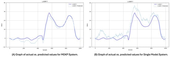 Comparison of the actual vs. predicted KAM values for the Multi-model and Single-model Gait-based KAM Prediction Systems. The close alignment of actual and predicted values in the Multi-model system demonstrates a higher prediction accuracy, especially across varying gait patterns.