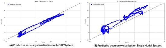 Further analysis of the predictive accuracy is shown in Figure 8, which plots the actual KAM values against the predicted values for both systems. In this comparison, the closer clustering of data points along the line in the Multi-model system demonstrates its ability to handle diverse gait patterns more accurately, whereas the Single-model system shows greater deviation from the ideal line. This comparison underscores the advantage of the Multi-model approach, which incorporates pattern-specific classification steps before KAM prediction, allowing for more precise KAM estimation across the varied gait types.