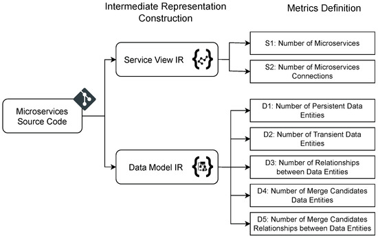 Figure 2. Service view and data model intermediate representation construction process. - Metrics Definition (Section 3.3): It employs the constructed intermediate representations to introduce seven convenient and automated metrics derived and adapted from both the service (S1, S2) and data (D1–D5) views. These metrics are designed to quantify changes within both aspects of the architecture to serve as indicators of the system’s main development stream and offer early insights into potential architectural degradation.