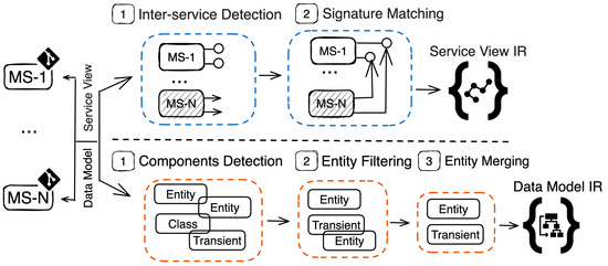 The construction of the data model view comprises three phases, as illustrated in Figure 2 (lower part). The first phase, termed Components Detection, focuses on identifying components, which are individual units or classes, along with their attributes within the source code. In the second phase, known as Entity Filtering, we select the data entities among the extracted class components. Then, we distinguish data entities, both persistent and transient. Transient entities are identified based on attributes such as setters and getters, which are used in the responses of endpoint methods. Additionally, entity relationships are identified from attribute fields that reference other entities within the system. The third phase, termed Entity Merging, identifies entities that are candidates for merging from different microservices based on similar names and matching data types between their fields. The resulting information is represented as an intermediate representation (IR) of the data model view.