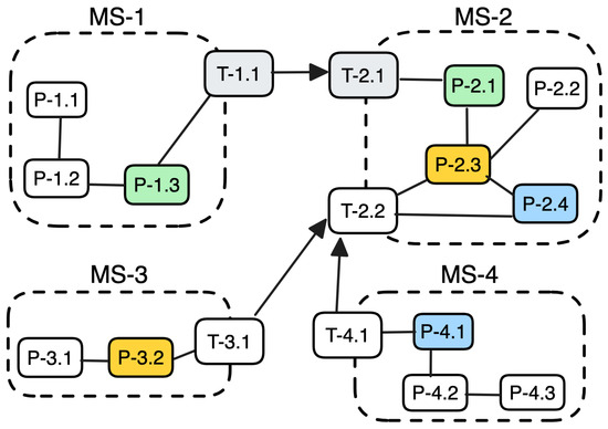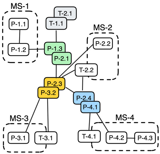 To illustrate the two metrics related to merge candidates, we demonstrated an entity merging process to identify potential merge candidates between data entities, as depicted in Figure 4. These resulting entities were generated by tracing the connections between transient data entities among microservices and the relationships between these transient and persistent data entities. In these two figures, entities with the same color represent similar entities that exist in multiple microservices’ bounded contexts. By merging these similar entities into a single entity, the total number of data entity merge candidates is four (). These candidates are (T-1.1 and T-2.1), (P-1.3 and P-2.1), (P-2.3 and T-3.2), and (P-2.4 and P-4.1). Additionally, there are one relationship merge candidate (), which is produced by a merge of the relationship between (T-1.1 and P-1.3) and (T-2.1 and P-2.1). These two relationships were merged because the merging process occurred in both of the entities they connected (T-1.1 and T-2.1) and (P-1.3 and P-2.1).