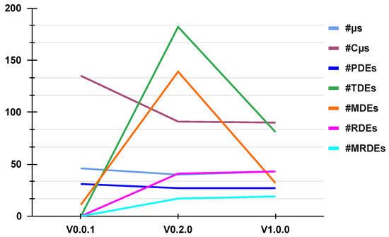 It decreased from 46 in v0.0.1 to 40 in v0.2.0 and then slightly increased to 42 in v1.0.0. This indicates a reduction in the system’s high-level components or a consolidation of functionality.
