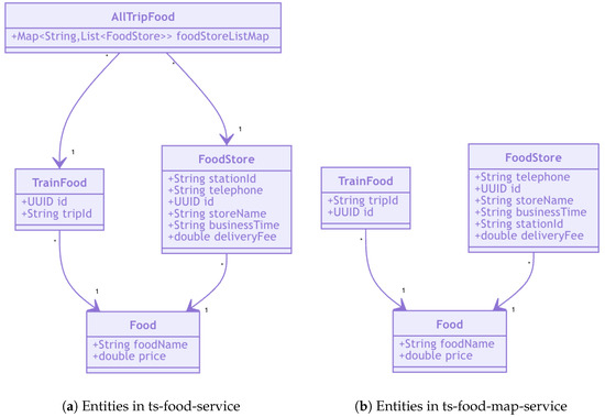 Addressing CQ4, this study provides insights into the process of merging entities across multiple bounded contexts. As highlighted in Table 6, v0.2.0 contains a total of 209 entities () within its bounded context. However, this number of entities is significantly reduced to 70 entities within the context map after merging 139 candidate entities. Upon closer examination of the system’s source code, it becomes apparent that 39 entities are duplicated across multiple microservices in v0.2.0. This duplication is particularly evident in v1.0.0, where 39 entities are consolidated into a single shared microservice named ts-common to address this concern. This is demonstrated in Figure 6, illustrating three related entities (Food, TrainFood, FoodStore) that are duplicated within the bounded contexts of ts-food-service and ts-food-map-service.