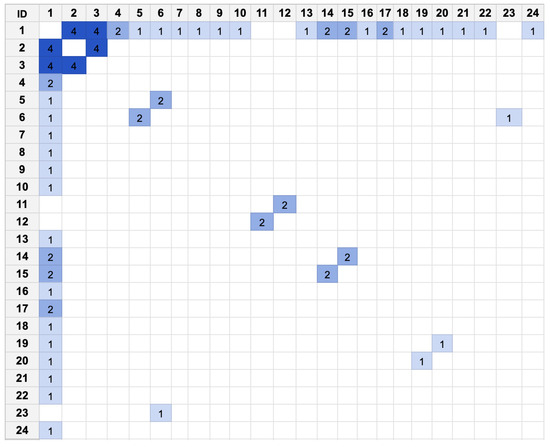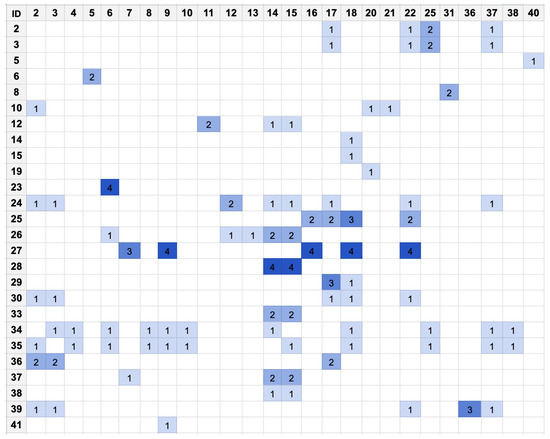 The flexibility of the presented intermediate representation allows it to adapt and be visualized through various visualization tools. These visualizations can significantly reduce the effort required to investigate and understand the source code. The intermediate representation provides holistic viewpoints (service and data) through tailored approaches. We utilized the heat matrix visualization presented in [32] to depict the number of dependency connections between pairs of microservices in TrainTicket v1.0.0, as shown in Figure 7. Moreover, for the same version, we utilized the matrix visualization to display data viewpoints through the relationships between data entities and identify merge candidates among microservices, as depicted in Figure 8. The shown matrices display the number of corresponding dependencies within the cells, using color depth to visually represent them—darker colors indicate more dependencies between each pair. The IDs in the visualization matrices correspond to the microservices listed in Table 7.
