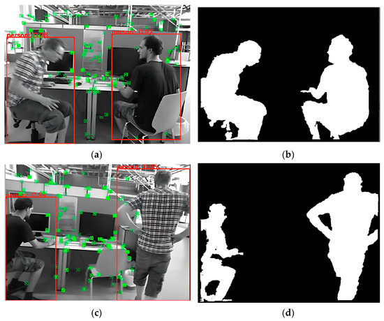 (a,b) and (c,d) are the semantic segmentation results based on the modified SLAM. Red indicates the detection boxes from YOLOv5x for object detection, while green represents the extracted feature points.