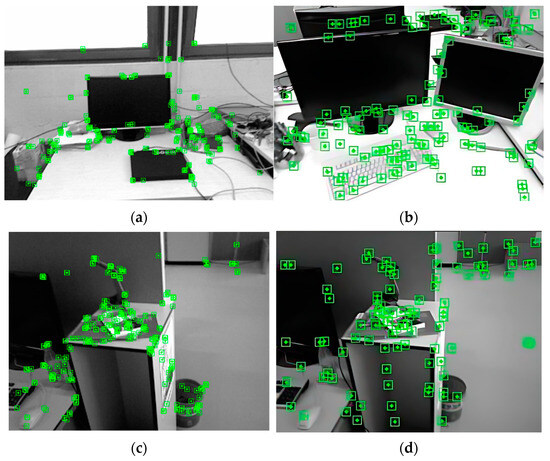 Figure 5 shows the feature extraction results of ORB-SLAM2 compared to the improved SLAM algorithm. As illustrated, ORB feature points were overly concentrated and even overlapped, which hindered feature matching. In contrast, even in areas with significant changes in viewpoint (as shown in Figure 5d), GCNv2 still extracted feature information uniformly, thereby avoiding overlaps and losses.