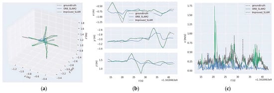 Table 3 compares the absolute trajectory errors of the improved SLAM method with ORB-SLAM2 across the four static sequences. The results indicate that, compared to ORB-SLAM2, the improved SLAM algorithm achieved a smaller RMSE and SD in all sequences. Notably, the improved SLAM’s RMSE was reduced by 19.9%, and the SD was reduced by 43.8% on the fr1/room sequence. Given that there were no dynamic objects in these static sequences, the experimental results effectively demonstrated that the improved SLAM algorithm exhibited greater stability compared to the ORB-SLAM2 algorithm.