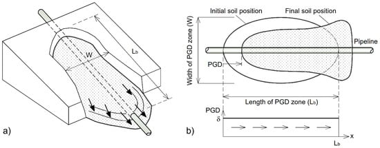 The response of buried continuous pipelines subjected to longitudinal PGD depends on the pipe deformation capacity under operating conditions, as well as the soil–structure interaction, amount of ground movement δ and its spatial extent Lb, and pattern of ground deformation (Figure 1).