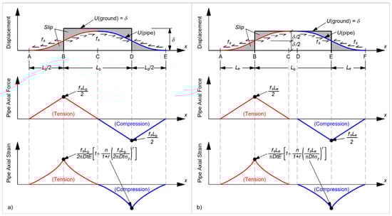 Pipeline response to longitudinal PGD according to analytical model in [], assuming symmetric material behavior for tension and compression: (a) case I; (b) case II.